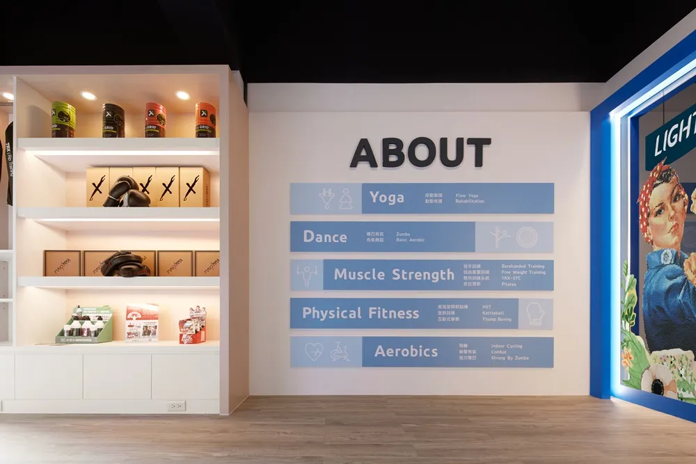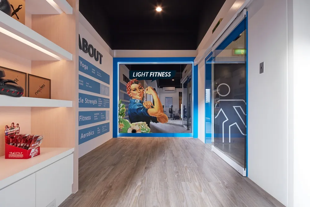 輕適能運動空間,特別針對女性市場,打造自在舒適.沒有壓力的健身場館。 如同我們替竹北分館量身打造的空間,延續品牌精神,特別在入口處,以女力時代來臨,用行動來証明,以1942年被視為賦予女權代表的《鉚釘工 娜歐蜜·帕克-佛雷》來做精神象徵,大聲宣告「我們都可以做得到!」。