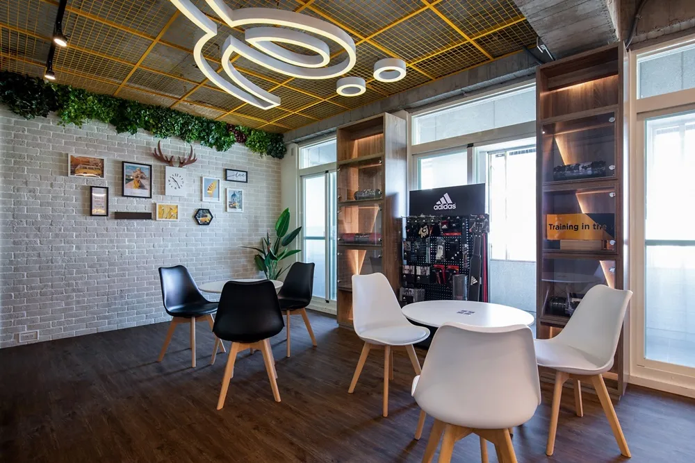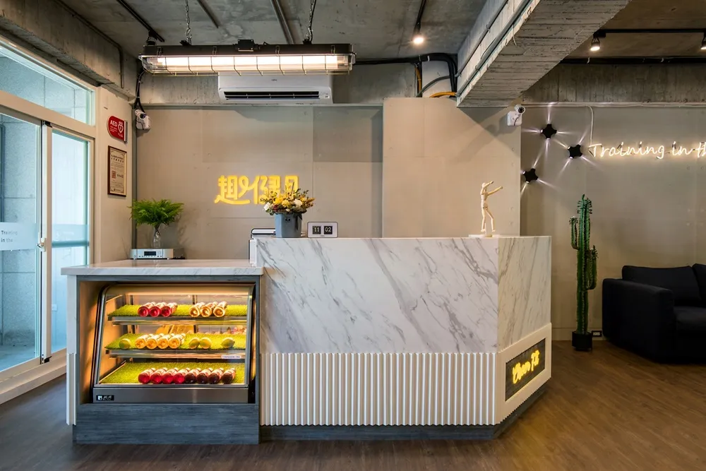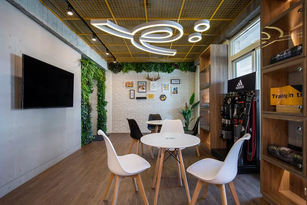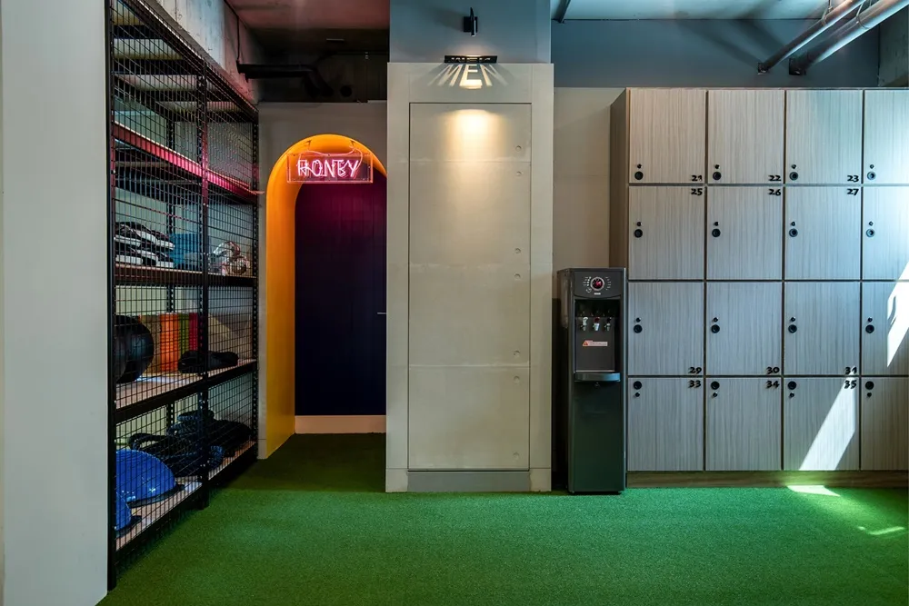 以孩堤的遊樂設施為發想,設計了不規則狀的Monkey bar;再以綠色草地作為空間的劃分,創造出左右環繞的動線。開放式的動線規劃,讓光線、空氣與人自然地連串在一起。草地上的線條標示出每一站,跟著刻度慢慢的往前,就算只是往前一點點,你會知道,你正在往更好的自己邁進。以人為本,擺脫傳統框架。加入燈光設計的「Honey」字體取代了普遍的標誌。意味著世間萬事萬物,人具有主體地位和意義。