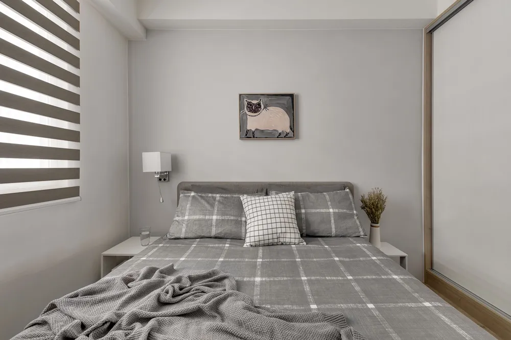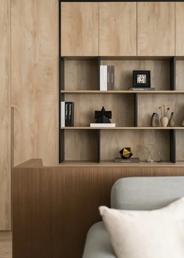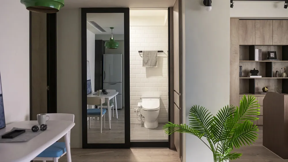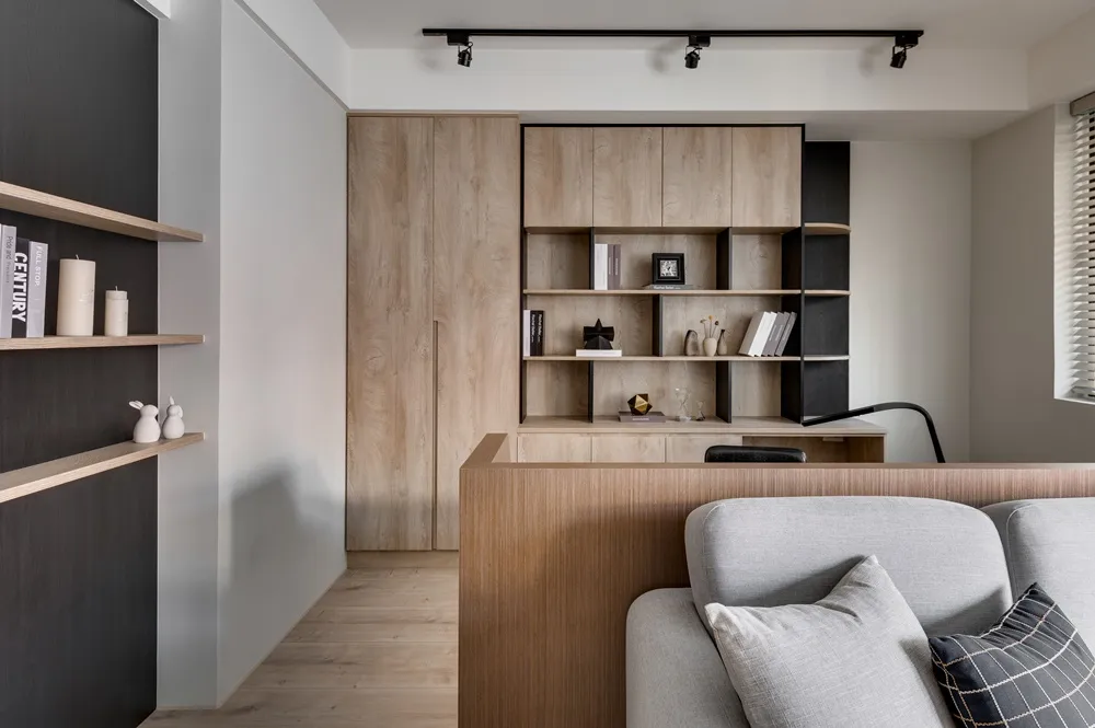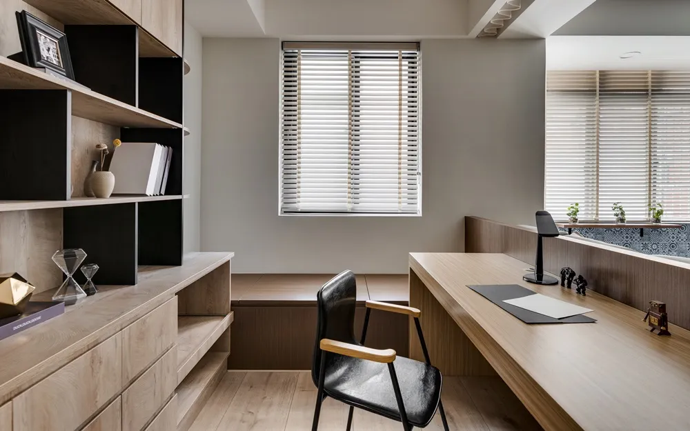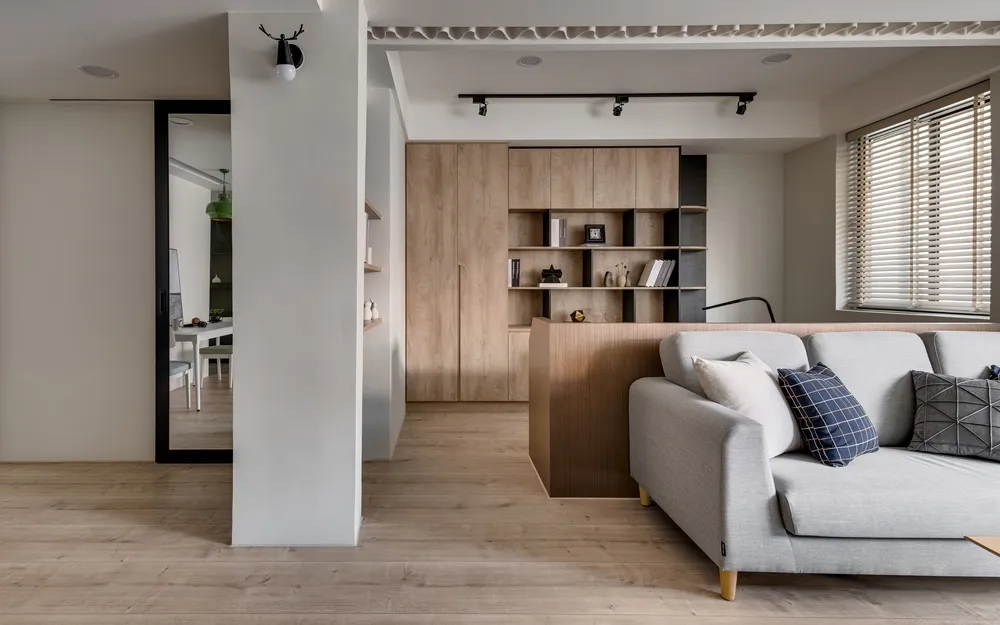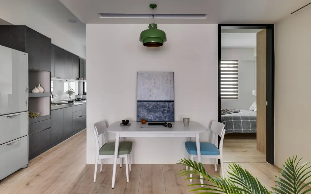 將客廳與書房打通,視覺感讓空間寬闊延伸,搭配著明亮光線的灑入,彷彿置身於大地之間,讓人心曠神怡。餐桌上懸吊著經典復刻墨綠色吊燈,呼應著壁面的淺墨綠,頓時讓餐桌後留白的主壁成為焦點!書房旁的臥榻,既能休憩又能收納,隱藏在天花的窗簾巧思,增加空間的靈活度。