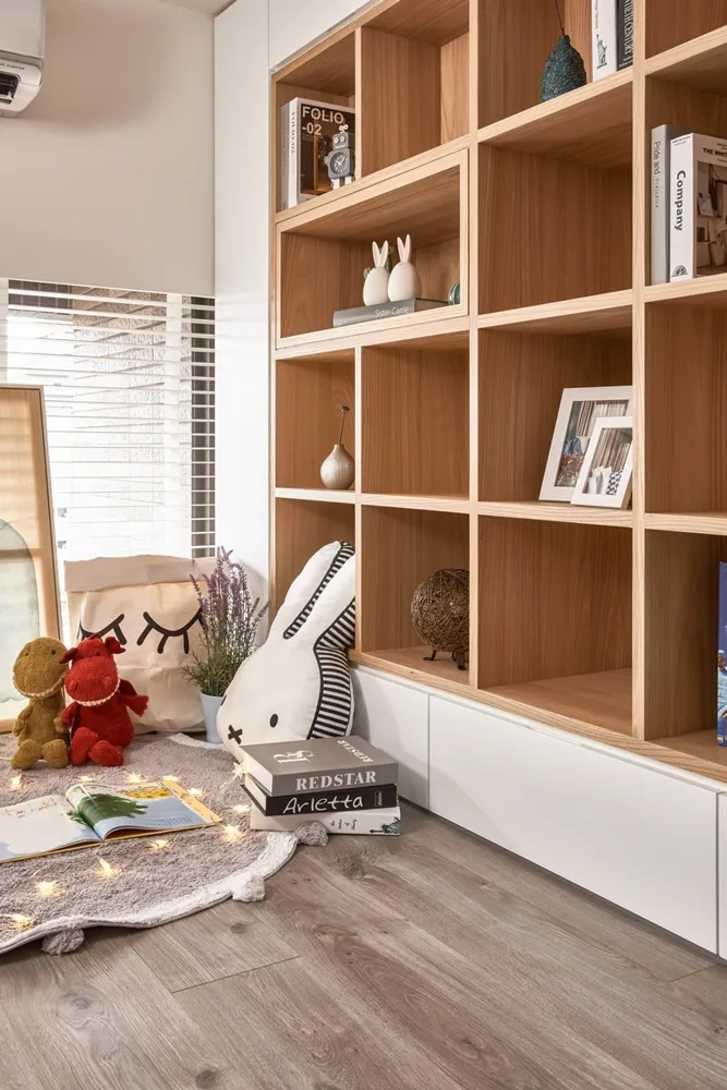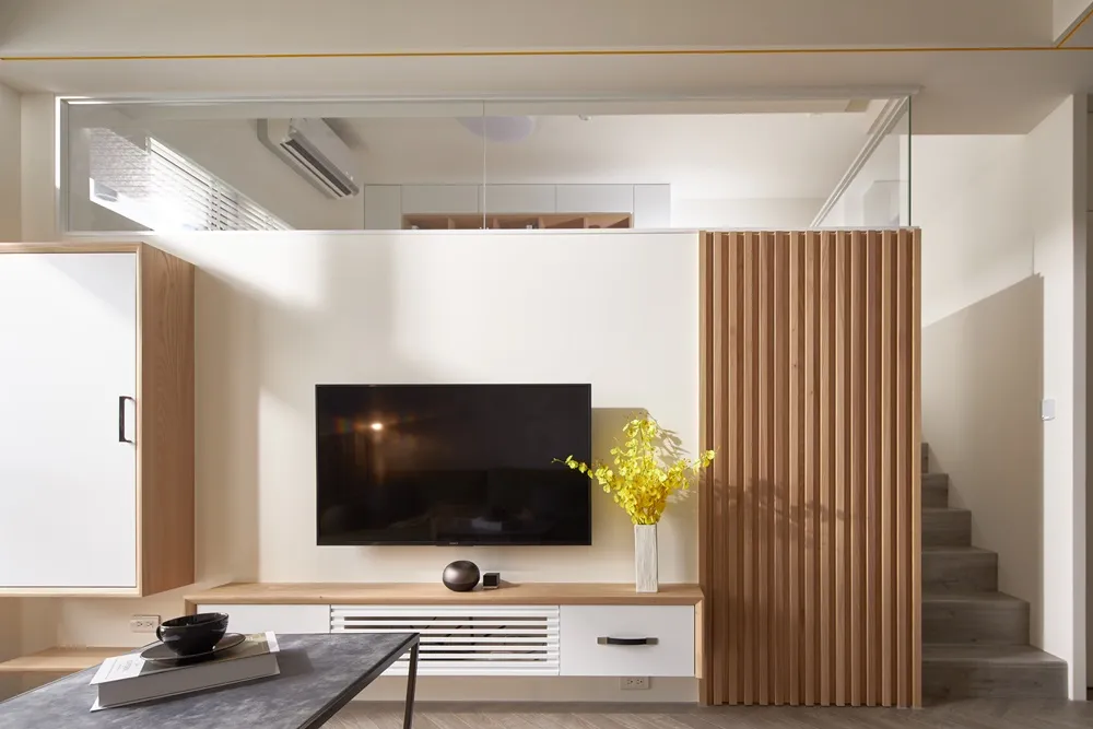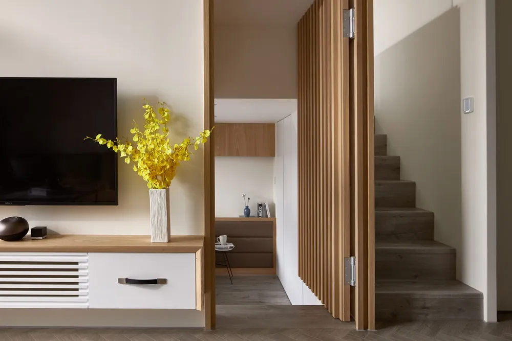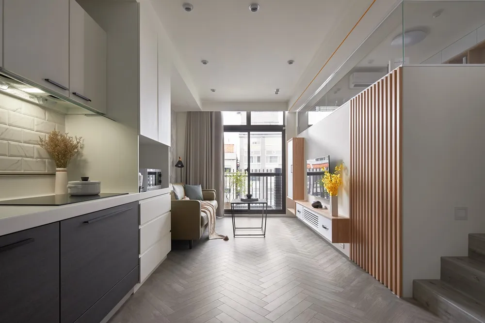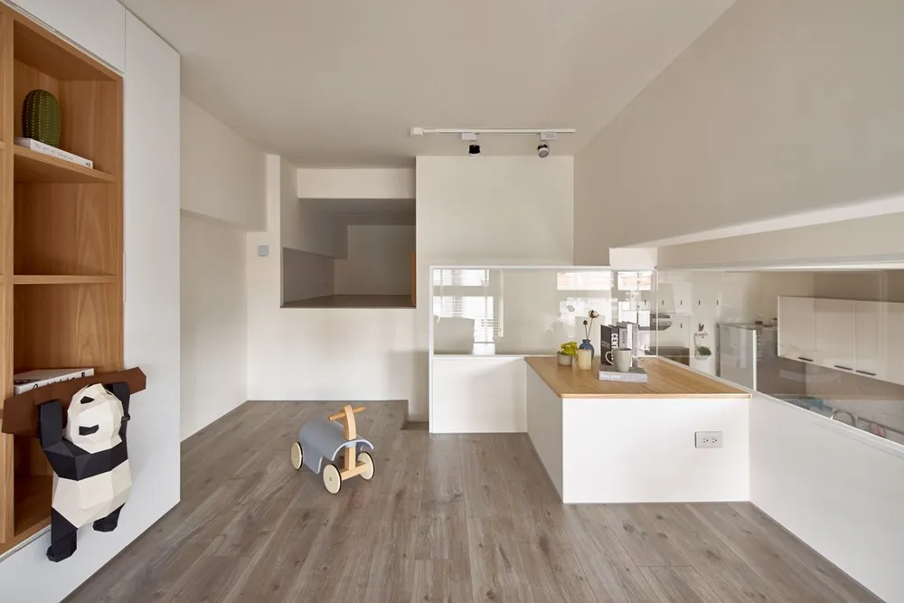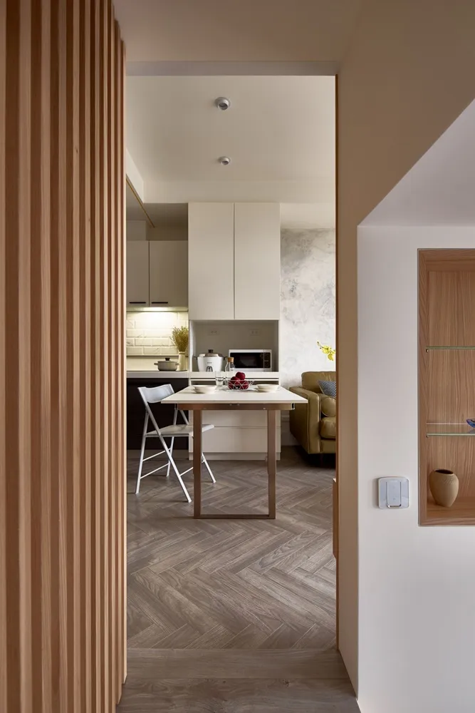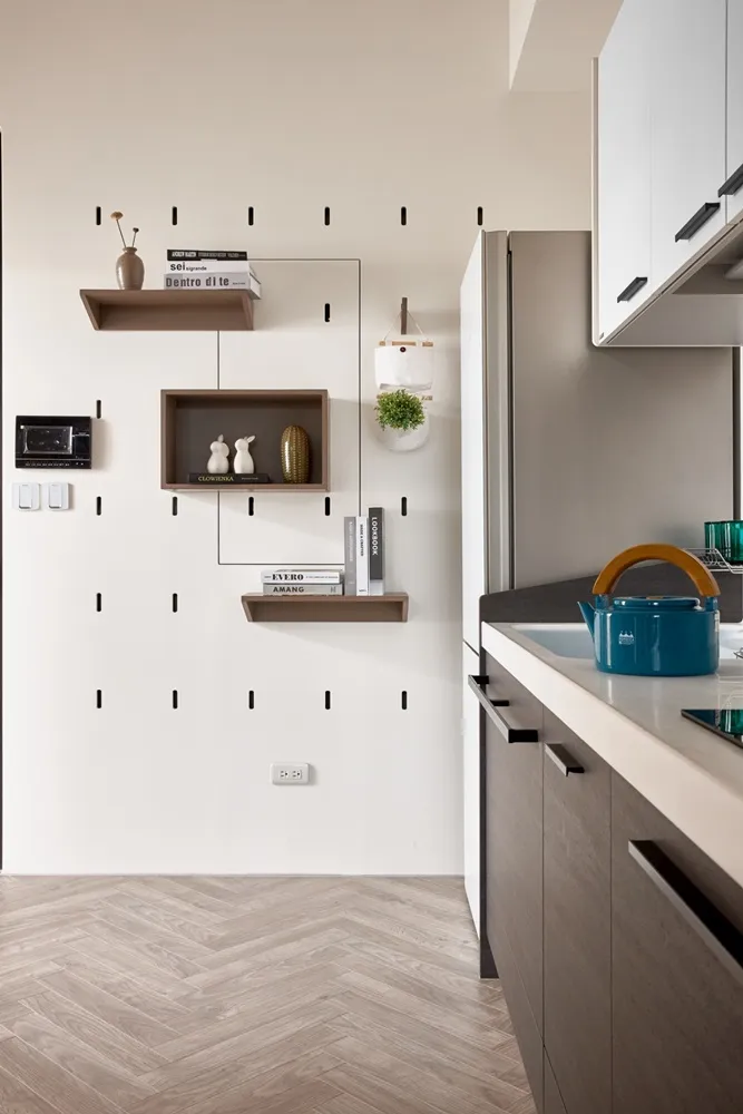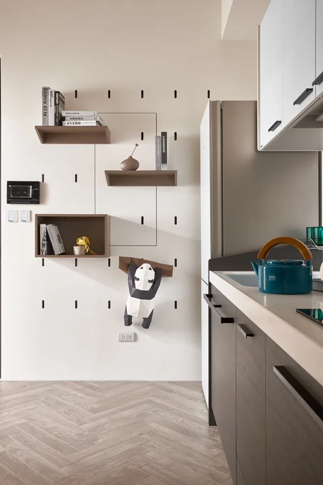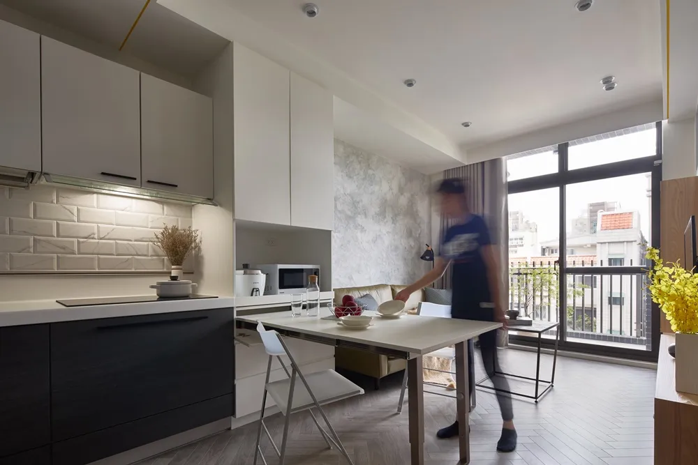 在有限的空間,不僅將色彩輕柔的帶入居家環境內,還加入了大量收納櫃,另規劃了「隱形餐桌」讓客餐廳隨時保持使用彈性的開放空間,解決居家小坪數常見的空間受限、收納不足問題。