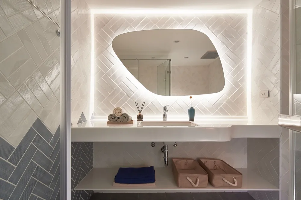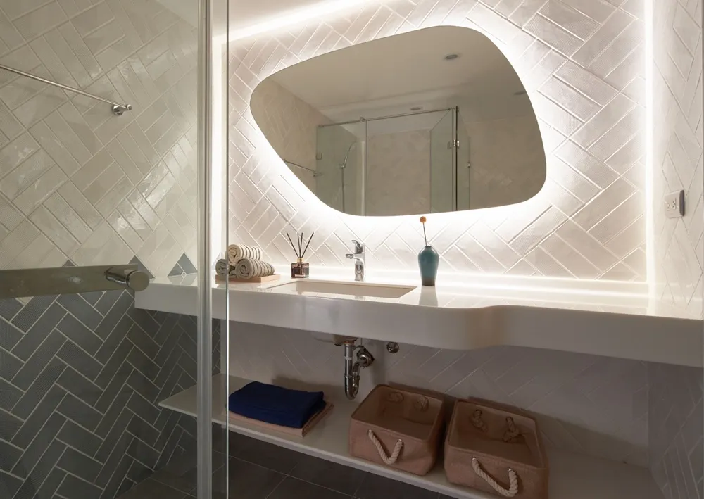 屋主希望居家空間是陪伴孩子成長的溫馨場域,希望藉由格局、建材與顏色,營造出適合親子互動的空間氛圍。我們援引大自然的天空、雲朵、草地與河流作為隱喻意象,將色調轉化為空間配色的靈感意象。以俐落線條抹上鮮豔的黃色,同旭日炎陽般金黃且充滿朝氣;衛浴空間則訂製的不規則造型鏡面搭配暖光,彷彿俏皮躲藏於雲朵後方的昇陽。