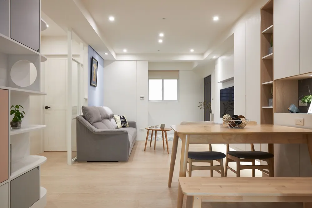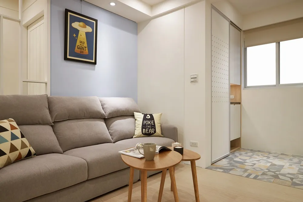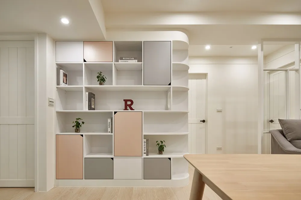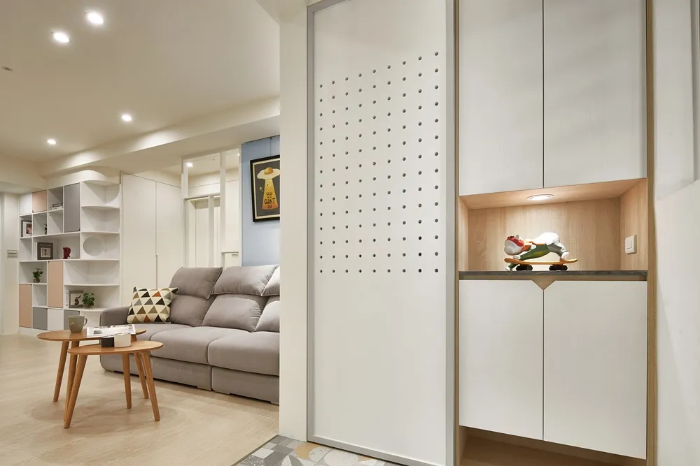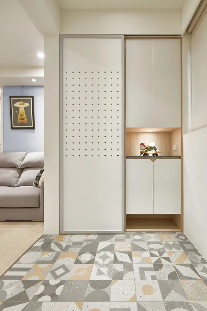 Mysa!! Mysa!!回到家映入的第一眼,趣味的洞洞板搭配幾何地磚,瞬間被甜滋滋散發出來的幸福感包圍,櫃體俐落的線條分割輔上優雅的曲線襯托,有股釋放壓力般的舒適,回到主臥以休憩和品味相輔,小孩房活潑的帶出童趣的宣言,盡情的玩樂。