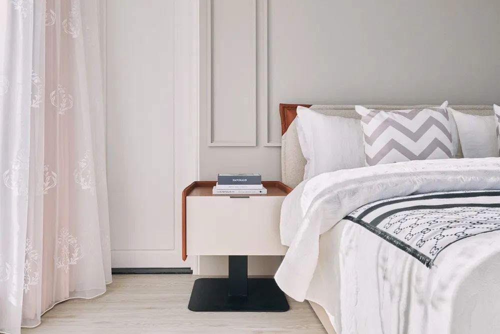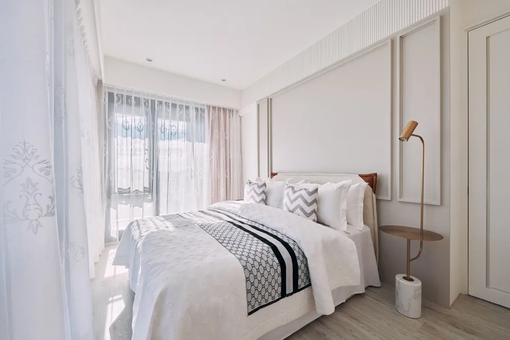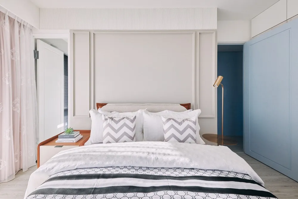 床頭的奶茶色與柔美的圖騰相互訴說著女主人的氣質。