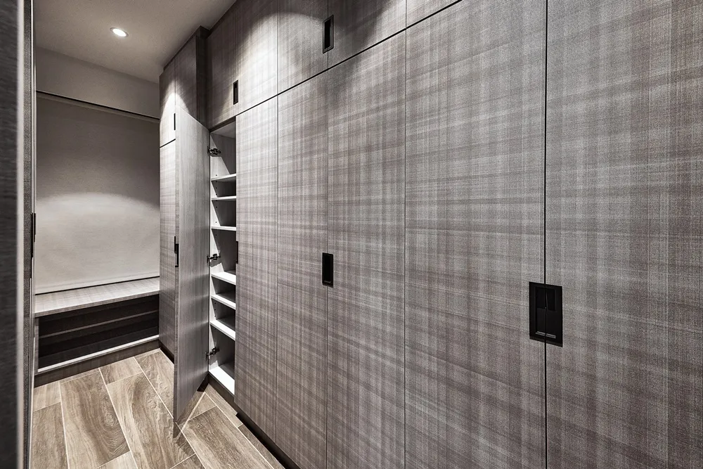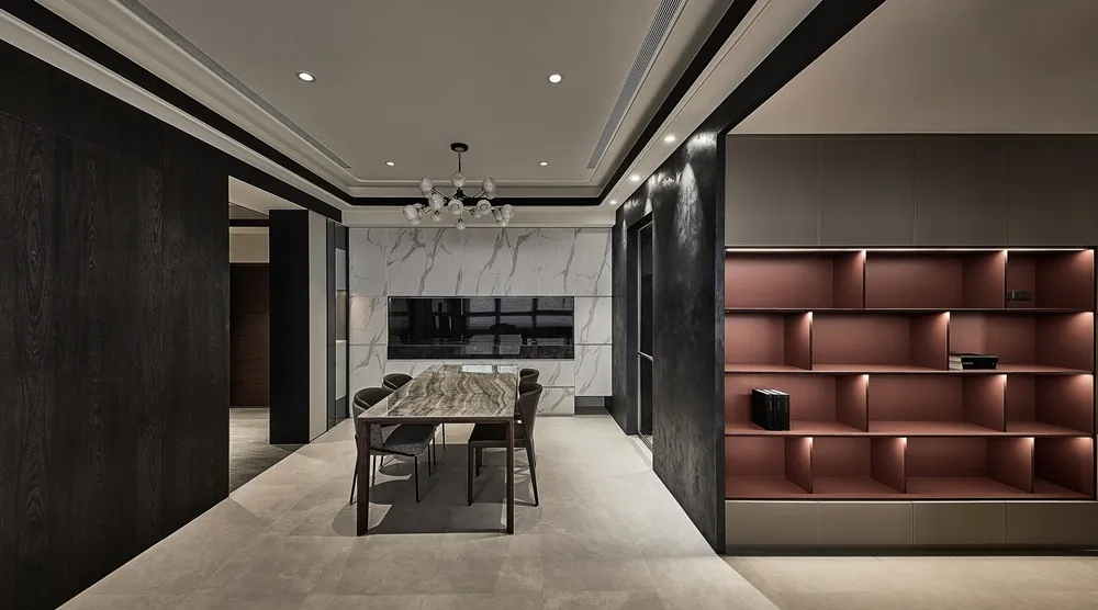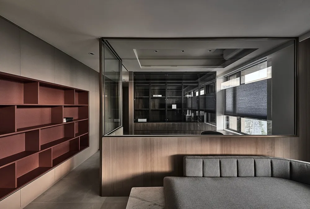 酒紅色書櫃搭配暖灰色系牆面 暗示著客廳與走廊空間場景的轉換