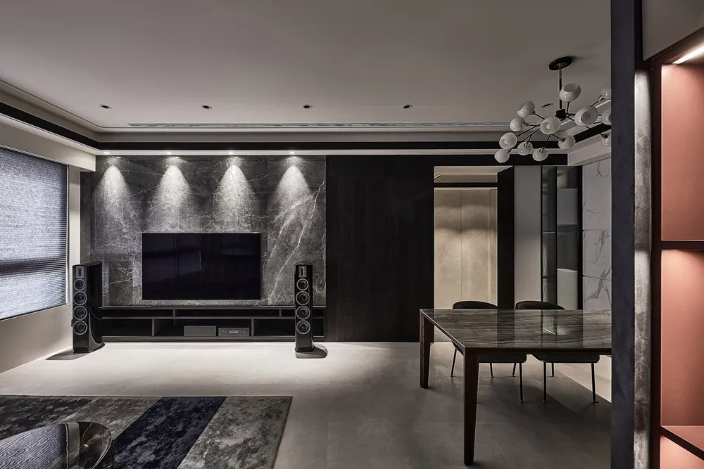 客餐廳運用特殊漆的雲彩絲絨質感與石材具有畫面張力紋理搭配