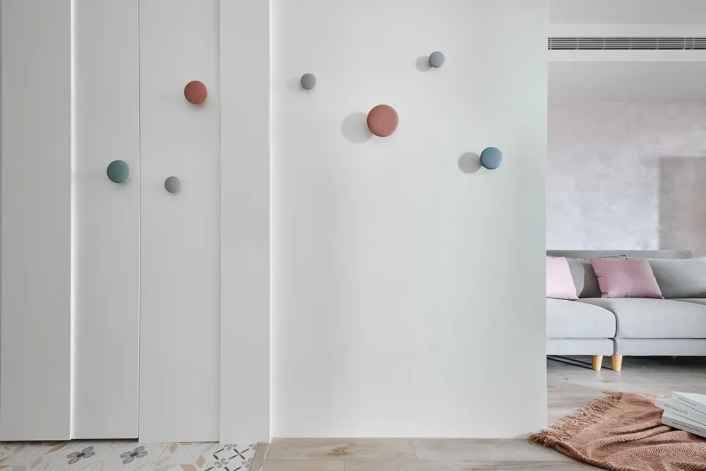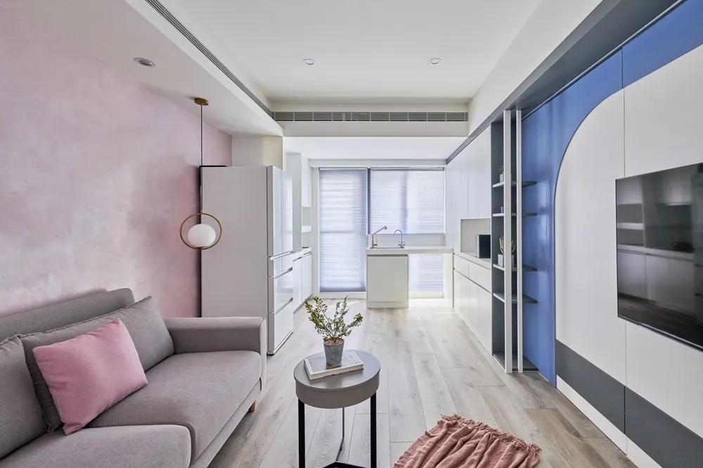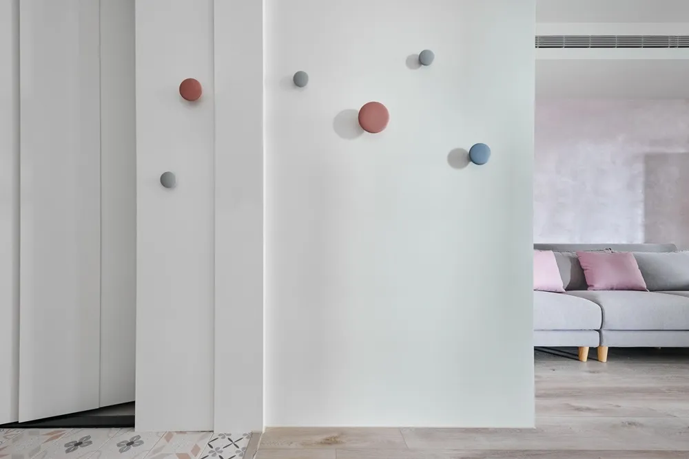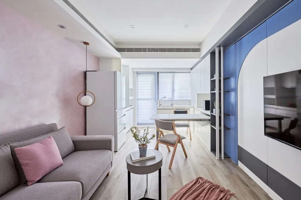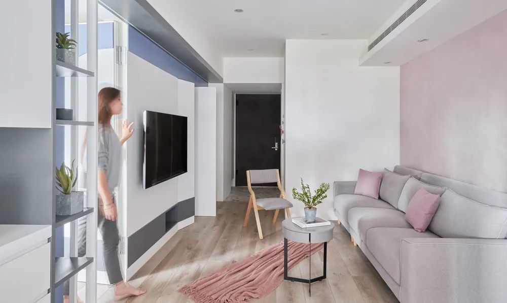 本案使用隱藏式手法創造出完整的俐落牆面,完美比例的線條分割下創造出富含隱藏餐桌、隱藏門扇、隱藏電視櫃及收納儲藏室,美觀下同時克服機能問題,空間經顏色渲染下,提升情感溫度層次,賦予空間幸福表情,陽光灑落室內,像極了一幅經調色後的水彩畫。