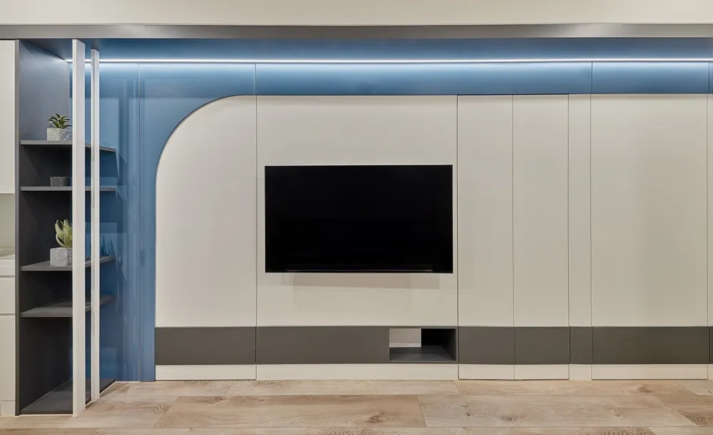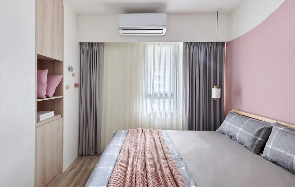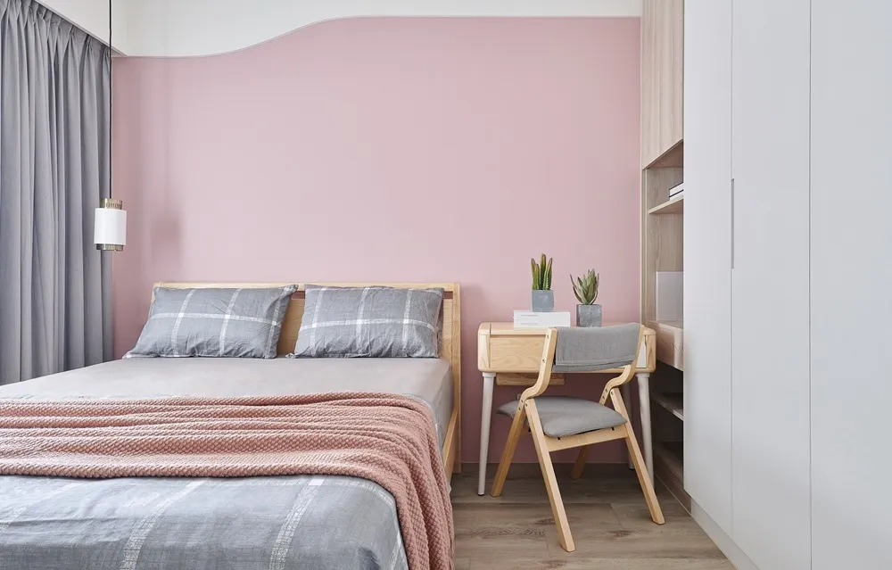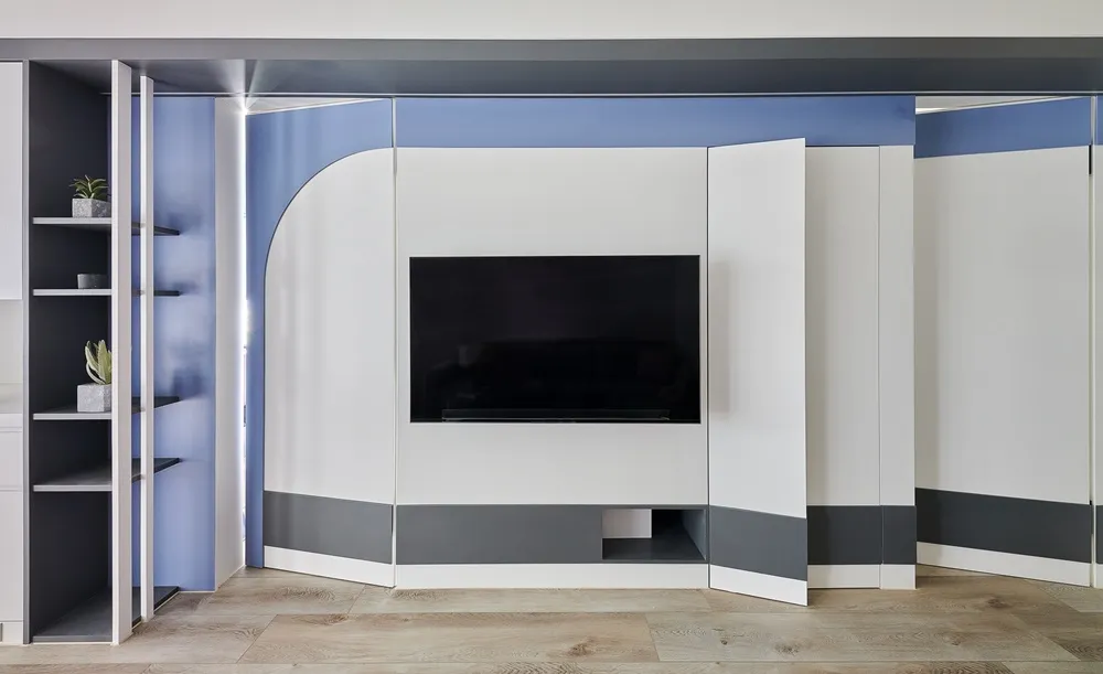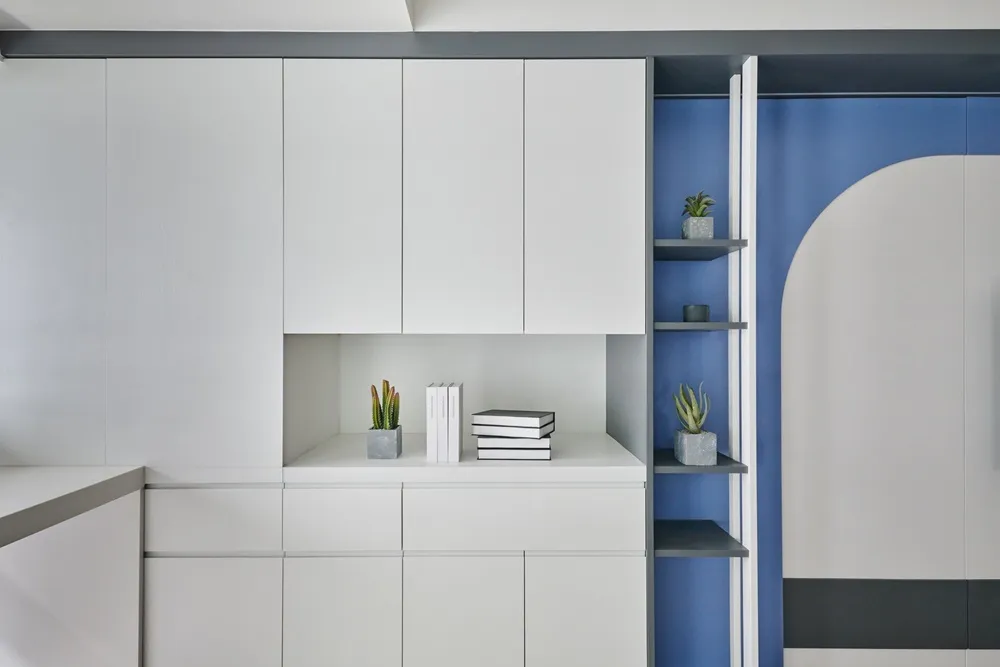 本案使用隱藏式手法創造出完整的俐落牆面,完美比例的線條分割下創造出富含隱藏餐桌、隱藏門扇、隱藏電視櫃及收納儲藏室,美觀下同時克服機能問題,空間經顏色渲染下,提升情感溫度層次,賦予空間幸福表情,陽光灑落室內,像極了一幅經調色後的水彩畫。