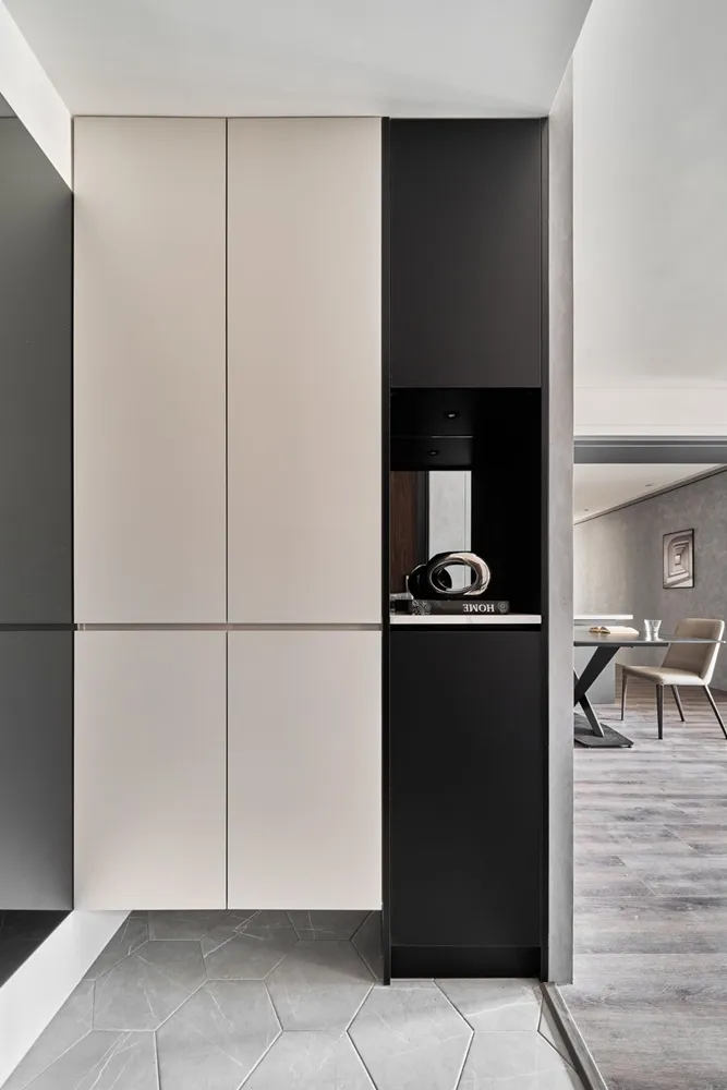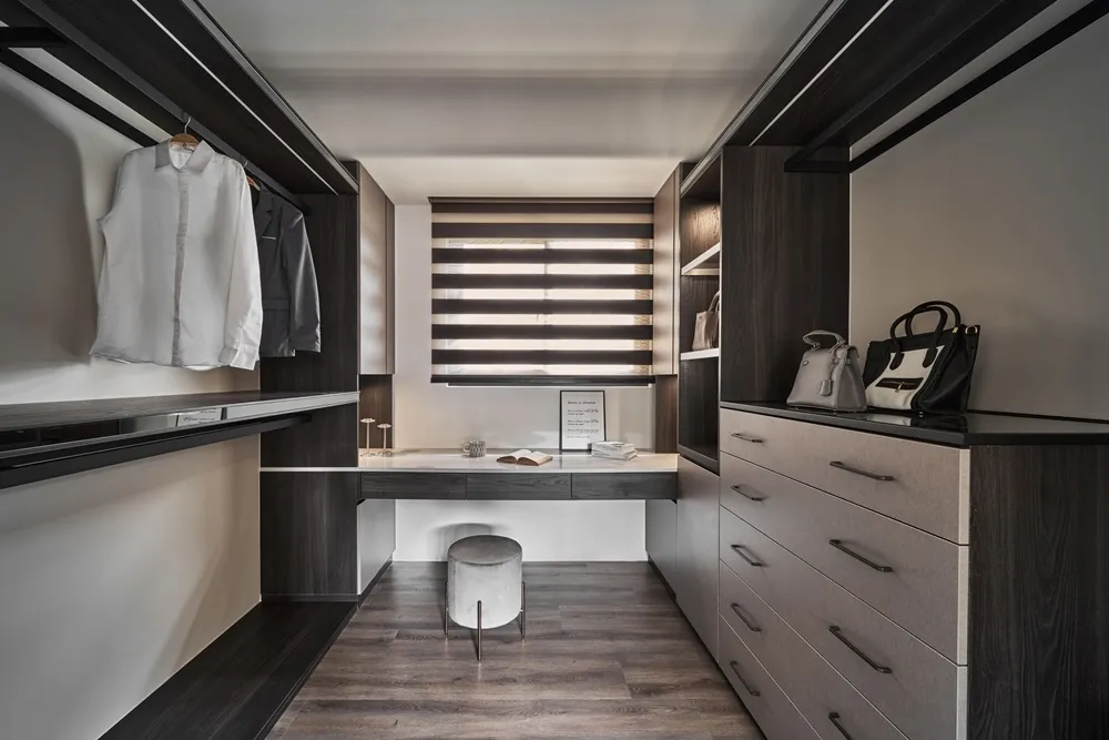 更衣室空間是以客廳及主臥室作為色調整合,創造出低調奢華的視覺感受,使用上也是有更多空間收納衣物,短邊衣物更是讓業主區分工作與日常所穿的衣物。