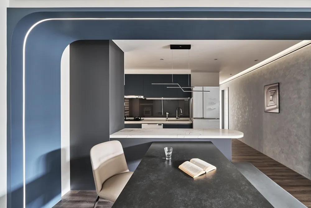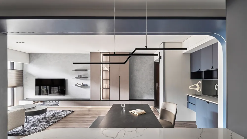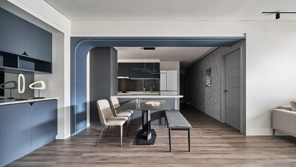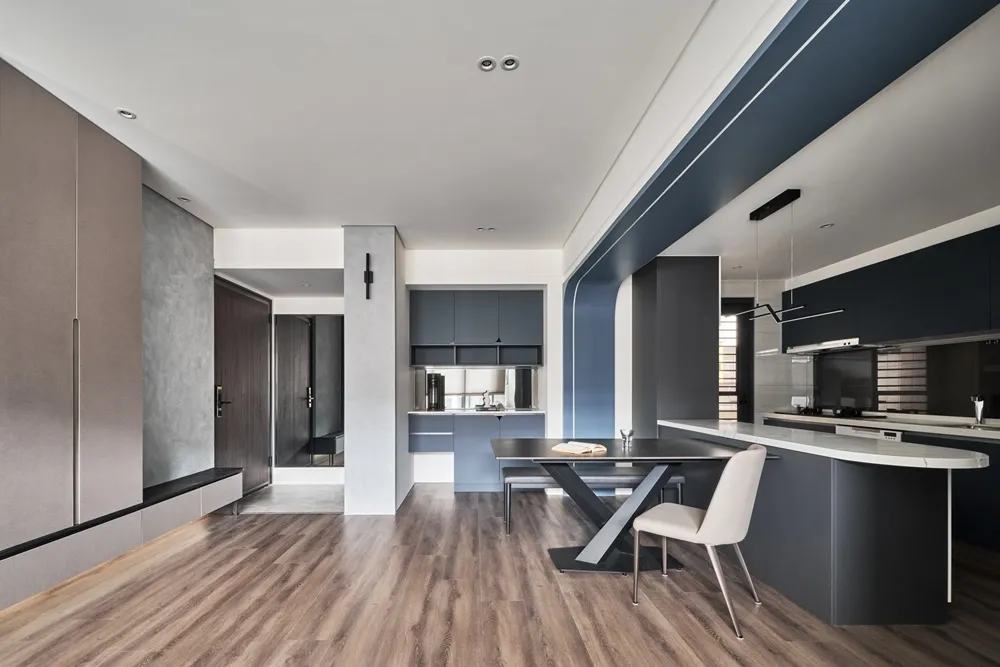 設計風格設定為現代簡約帶一點工業風的色調,穩重中又帶一些燈光線條的俐落感,吧台上方的圓弧角及餐櫃門片上的弧型把手讓空間看起來更圓潤。