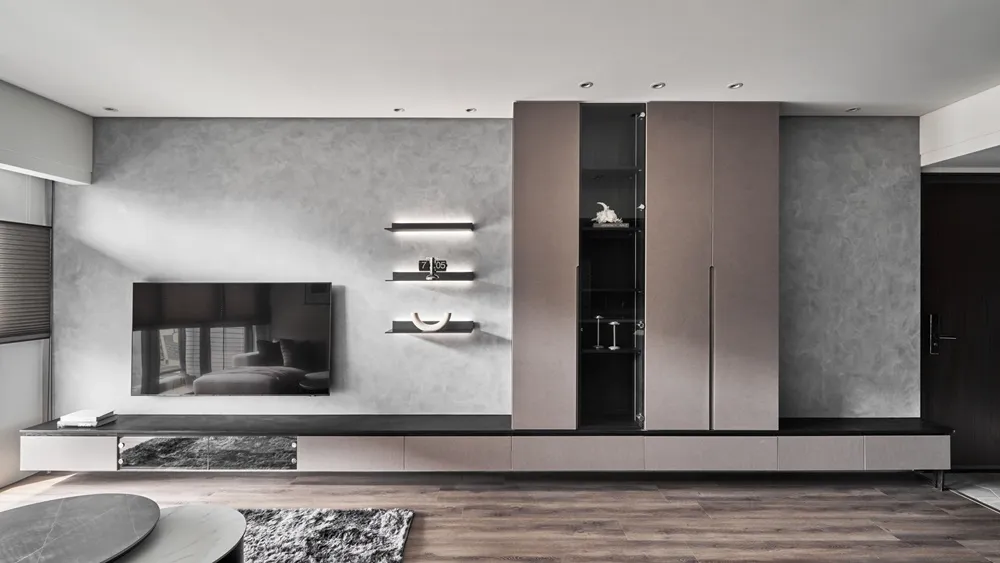 客廳電視背牆與走道牆面使用相同的藝術漆塗料,讓視覺感有呼應的效果。