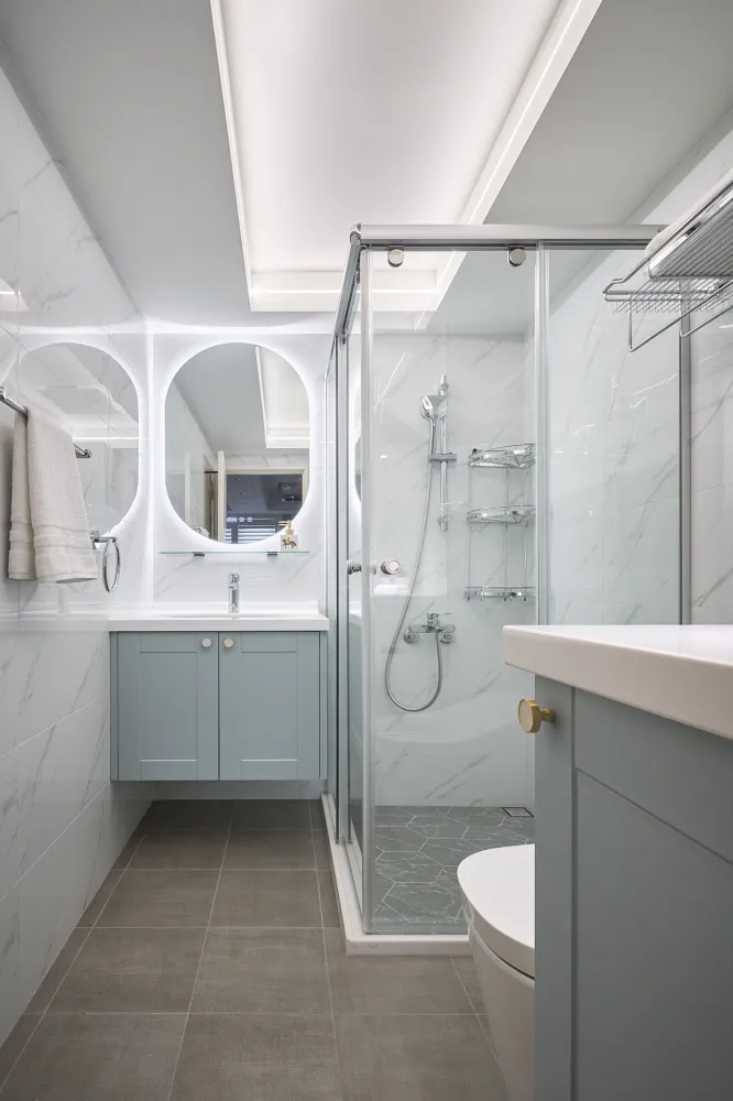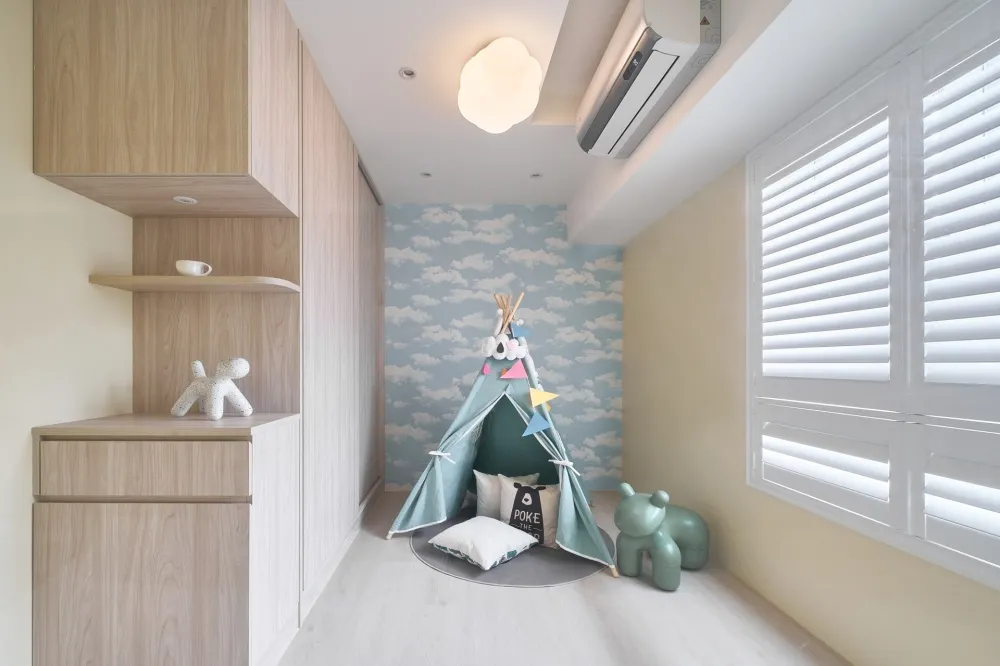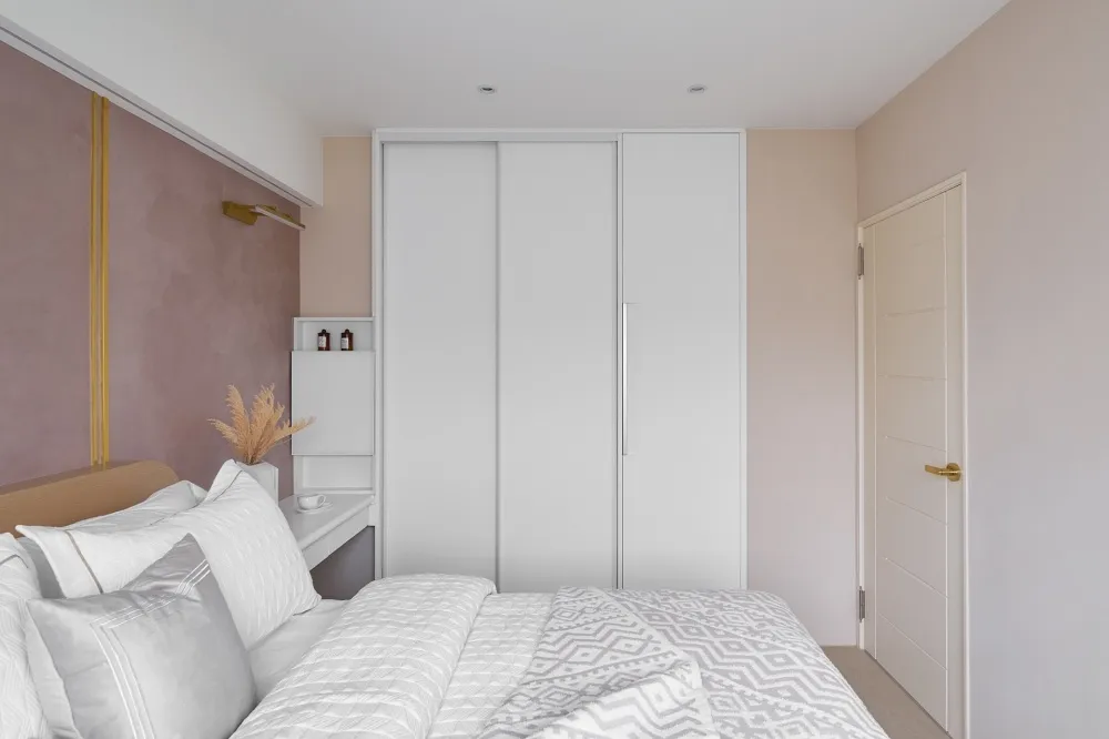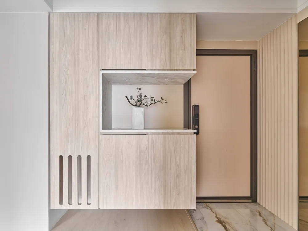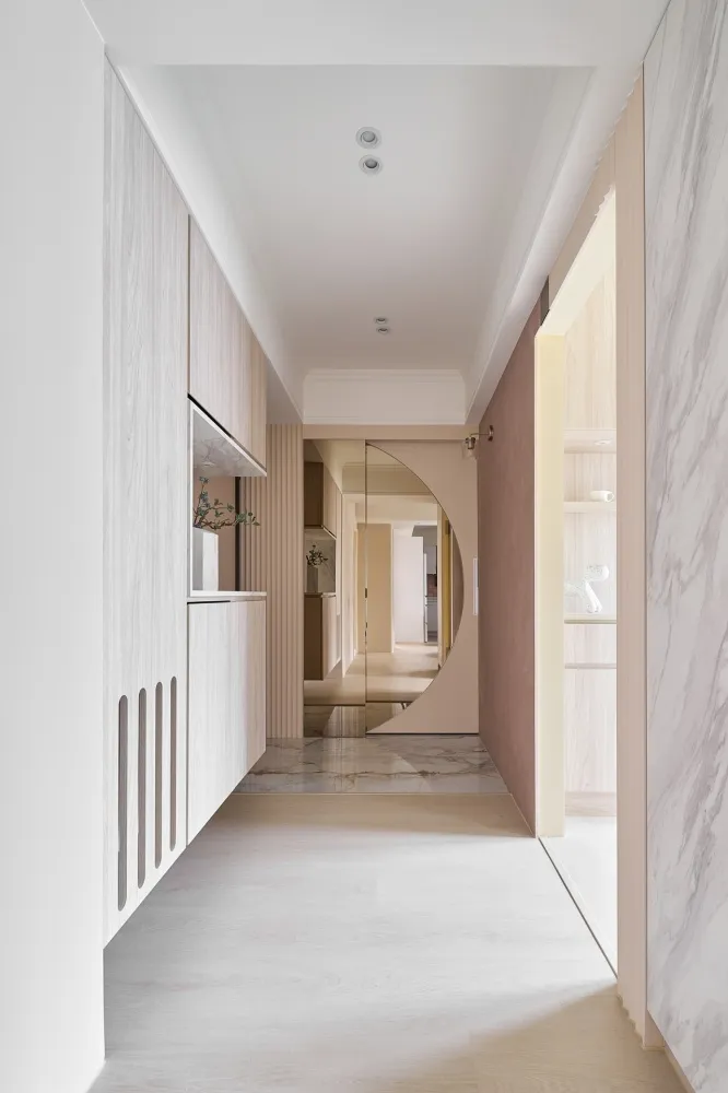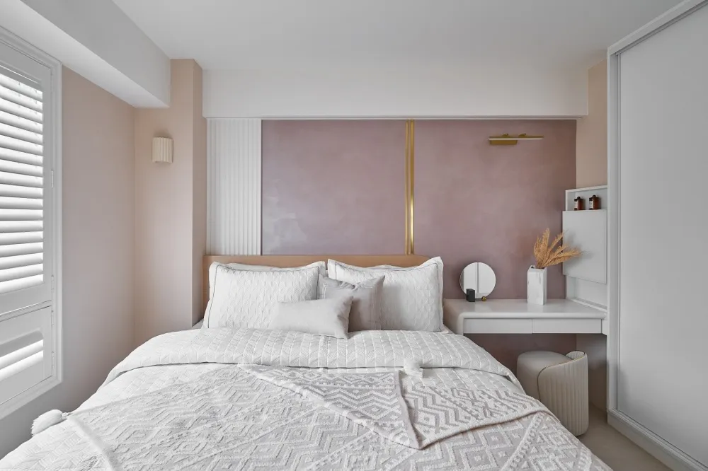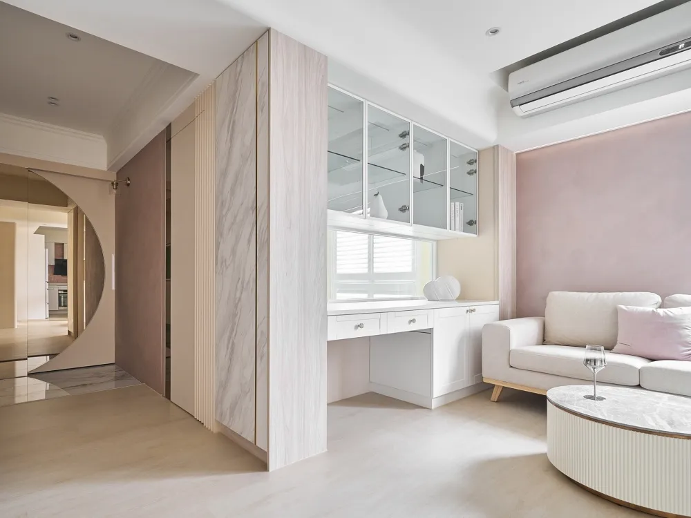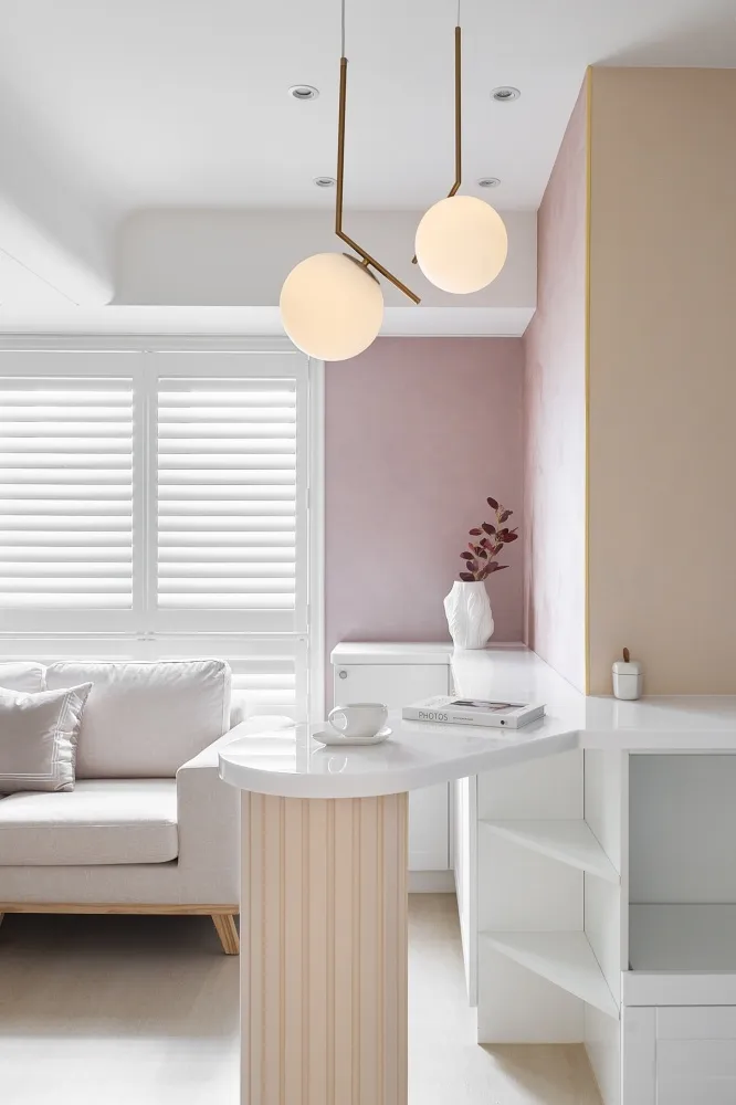 Bubble Pink 主持設計師 黃仲均 George 室內面積 16坪 設計風格 美式風 使用建材 得利乳膠漆、木製格柵、茶鏡、系統櫃、喬豐門片、一太淋浴門、國產磁磚、粉紅色地鐵磚、玄關西班牙大板磚、鐵件、石膏磚、壁紙、通越木皮、百葉窗、石塑地板、義大利藝術塗料、樂維透心美耐板 設計發想 透過局部的木紋系統板材,讓整個空間更加溫潤,也運用銀狐的美耐板讓空間有另一個層次。同時我們也透過格局的重新規劃,讓每一個使用空間都充份利用,沒有閒置的空間。