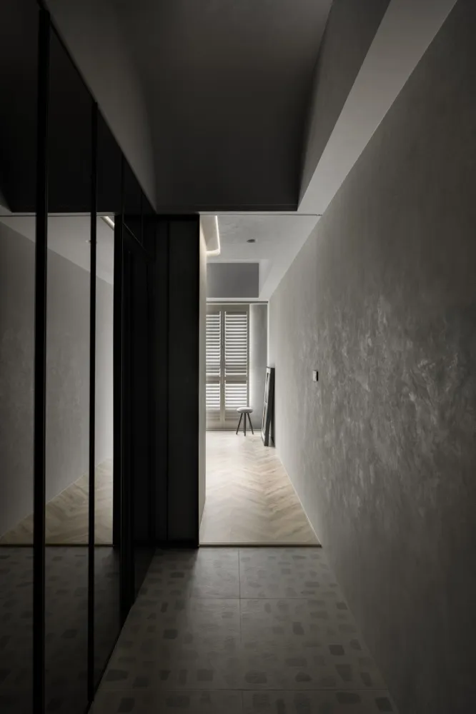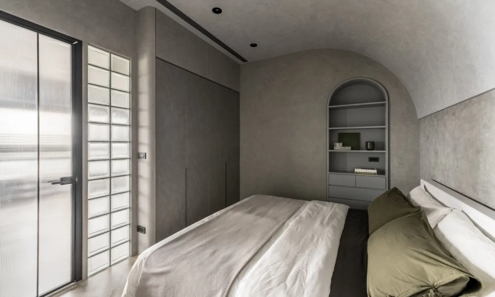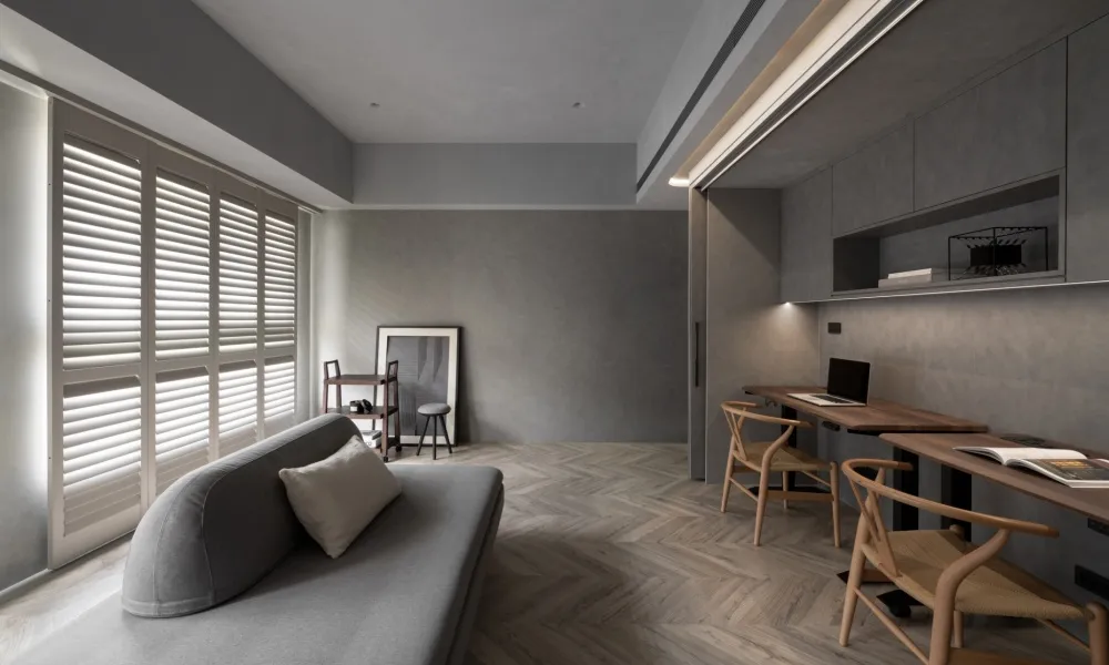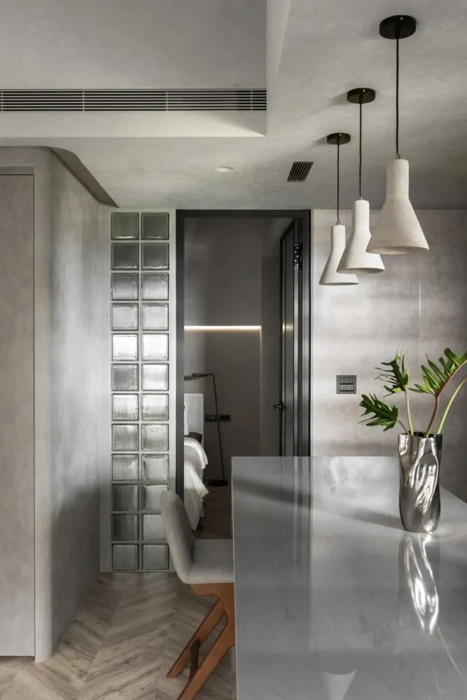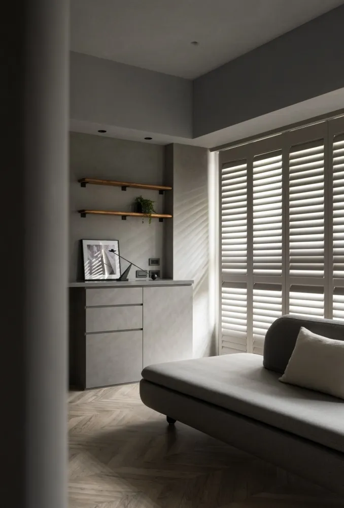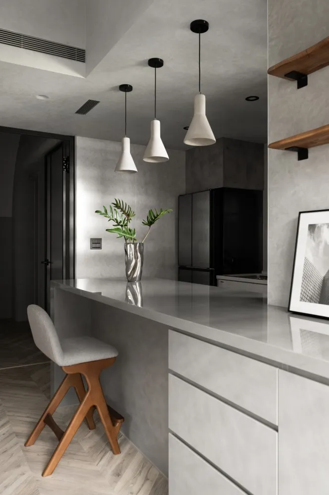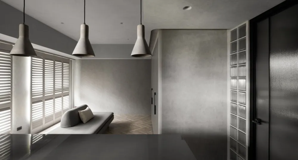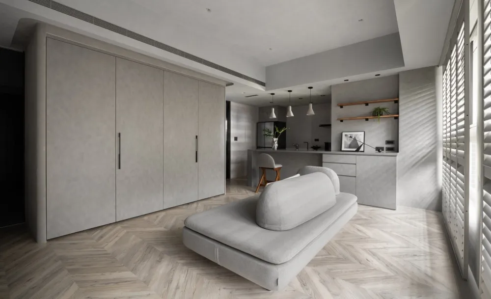 樸寓 主持設計師 黃仲均 George 室內面積 13.5坪 設計風格 侘寂風 使用建材 義大利進口磁磚、杜邦人造石、進口玻璃磚、義大利藝術漆、鋁框玻璃門 設計發想 徜徉世界各地旅途 總有 如是安心散落自己 所在 無彩靜謐堆疊生活 灰色 引光入室圓圓弧弧 擁抱 是你 是我 是我們 如常相伴