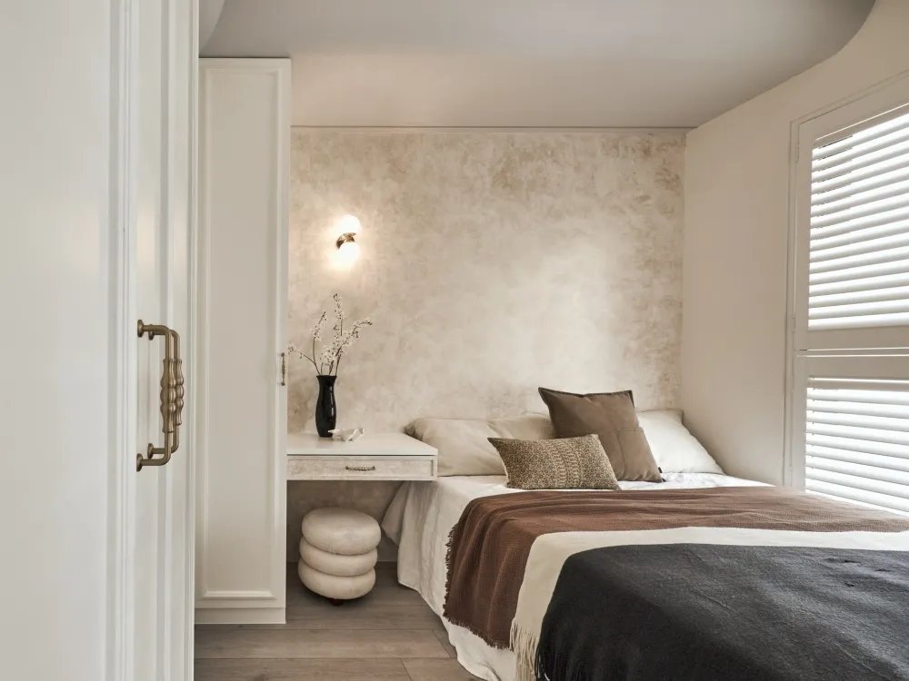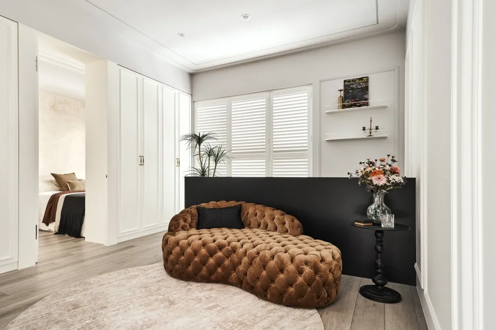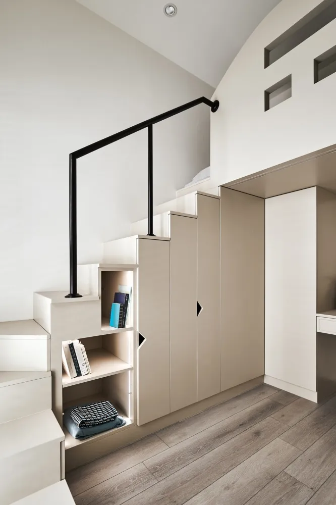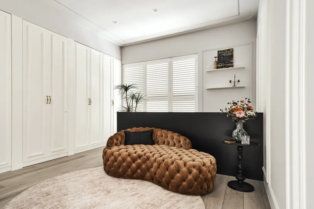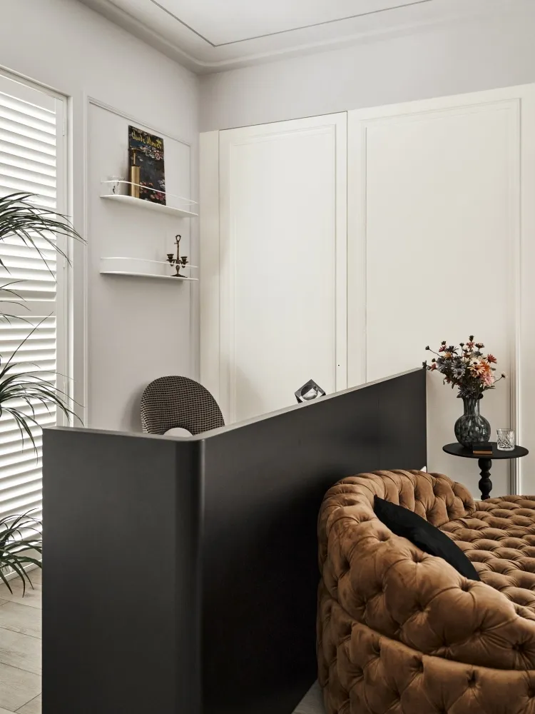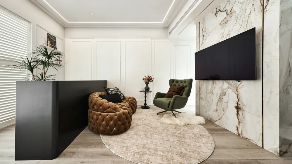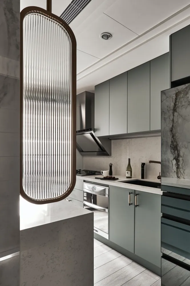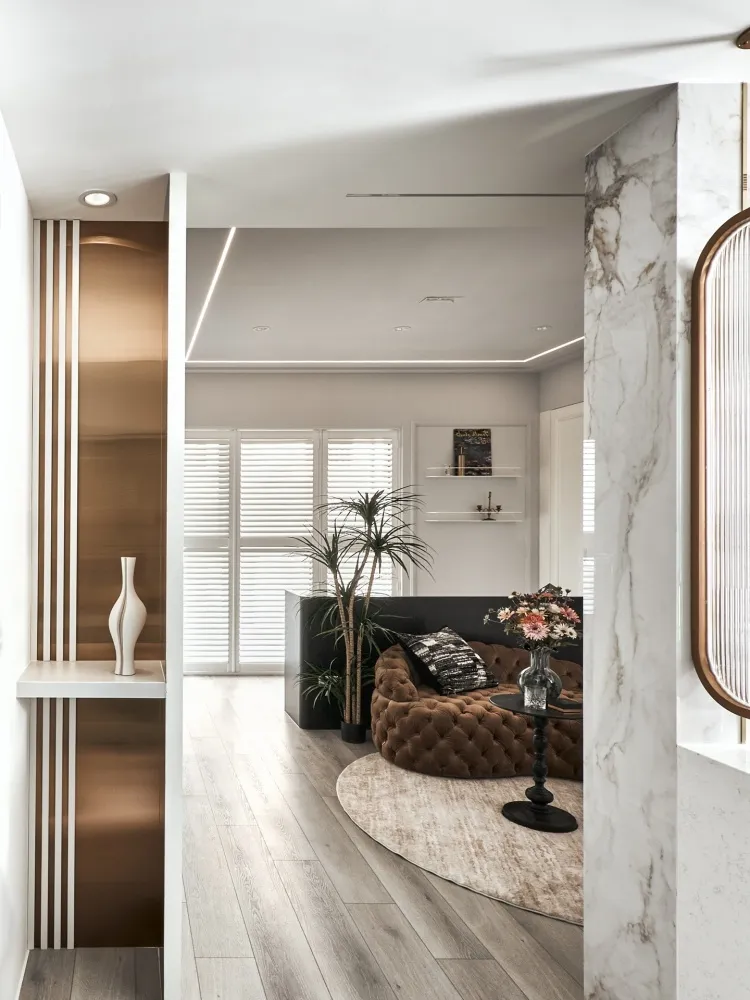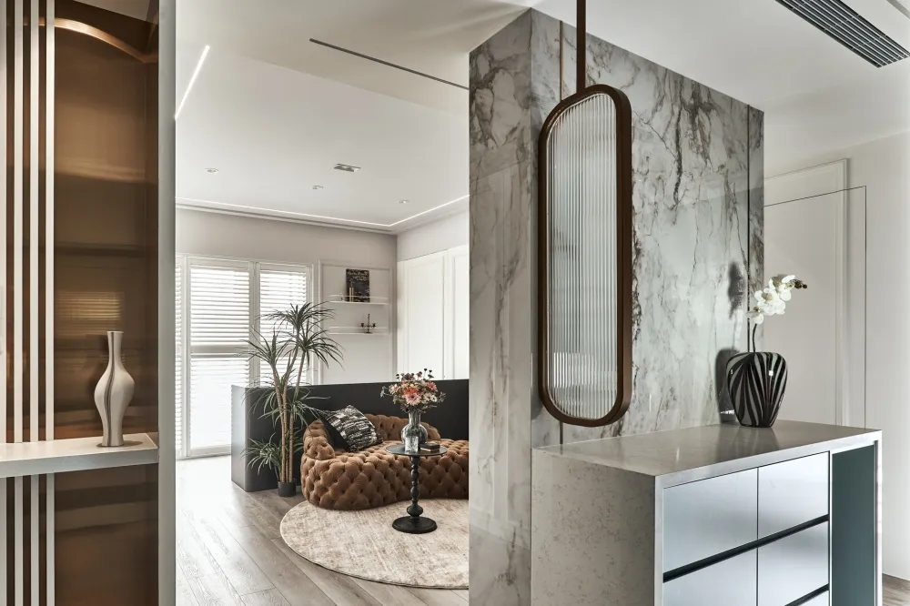 星語 主持設計師 黃仲均 George 室內面積 13坪 設計風格 現代輕奢風 使用建材 卡拉拉白石英石/大板磁磚/鐵件烤漆/進口藝術漆/金屬鍍鈦板/百葉窗 設計發想 開放回字型的動線讓空間感放大,自然光透過百葉窗的形式漫射進來,天花板造型以圓弧和線型燈營造氛圍,牆面簡單不複雜的美式線板整齊劃一,加上鐵件和鍍鈦的點綴,帶出現代簡約輕奢的美式風格。