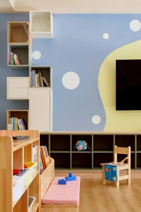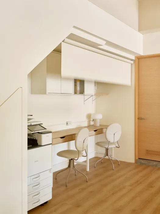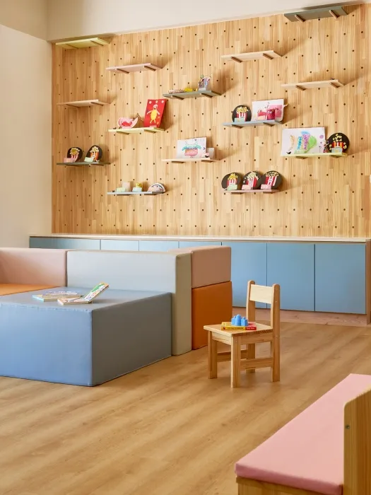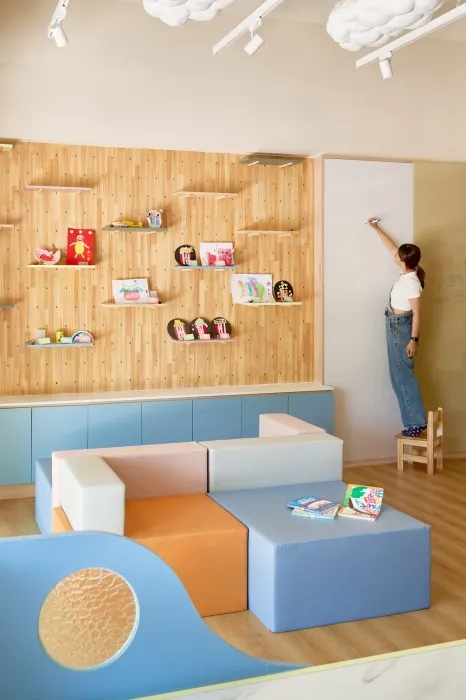 白雲、藍天與波浪,化作空間中的語言:米色天花板是輕盈的雲朵,主牆上的流線波紋延伸成南瓜馬車的輪廓,浪漫中帶著童趣;原木洞洞板則像小鳥的窩,溫暖而真實。