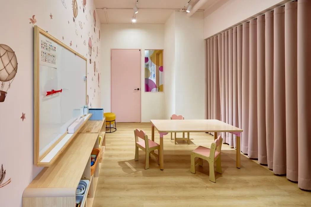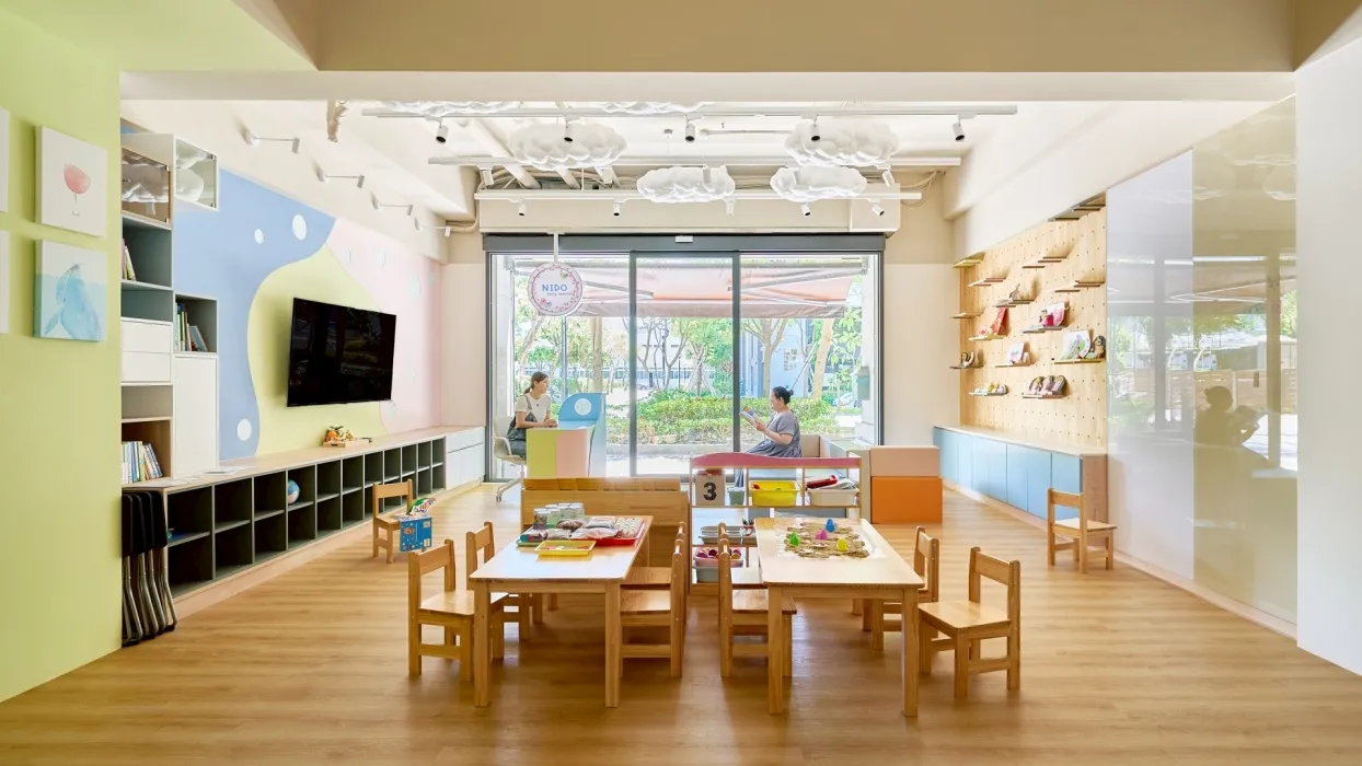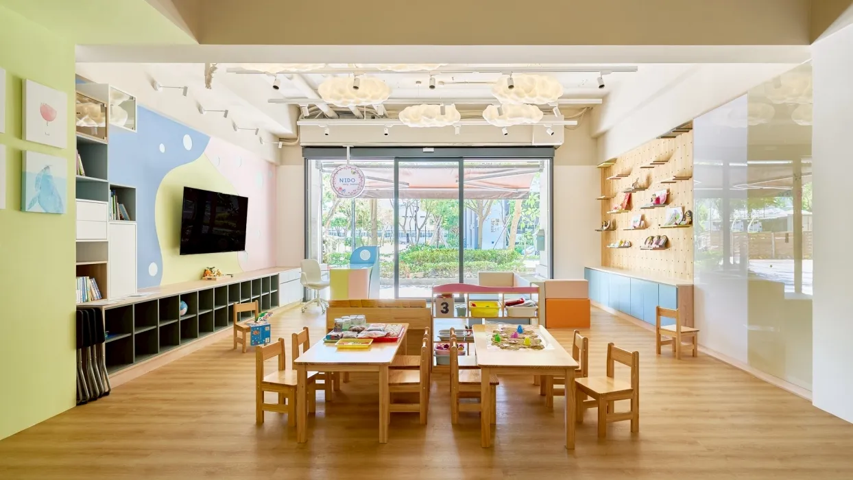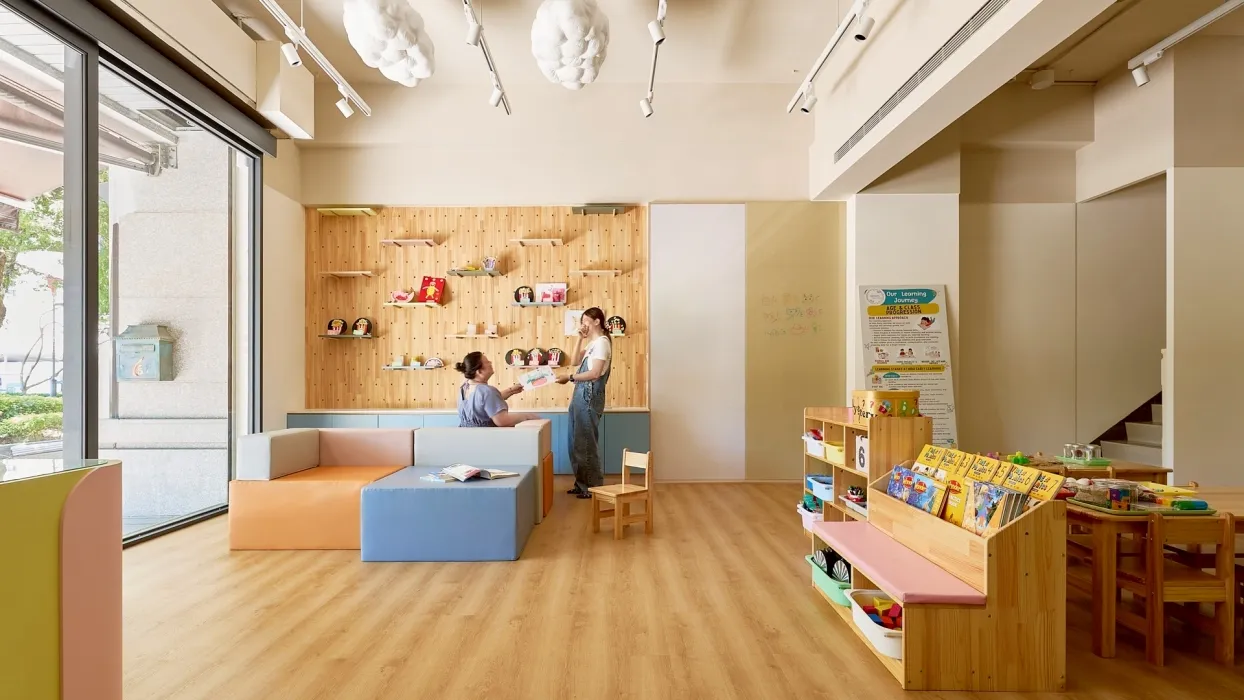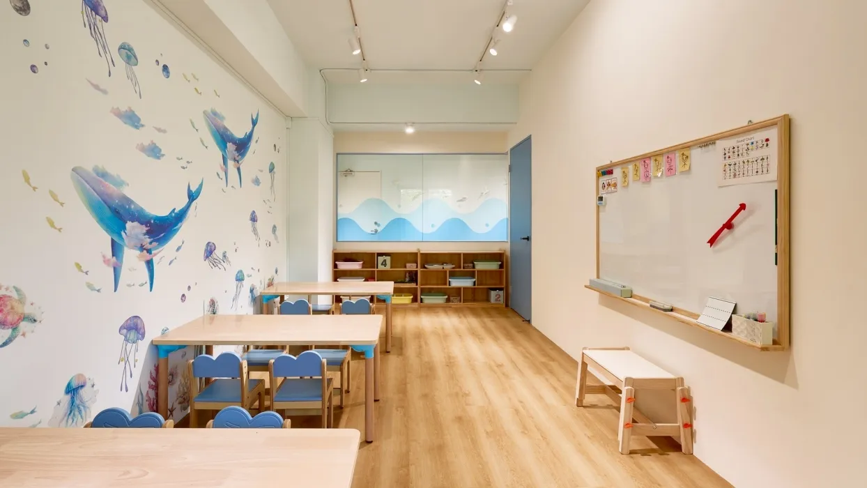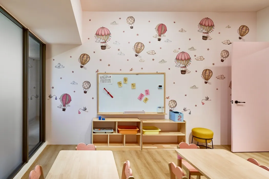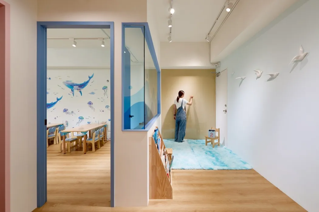 走上二樓,幾隻小鳥在公共區翱翔,彷彿引領著人們進入想像的國度。藍色教室沉入海底世界,波浪玻璃映照著悠遊的鯨魚;粉色教室則乘著熱氣球飛向天空,窗邊多彩氣球隨風搖曳。